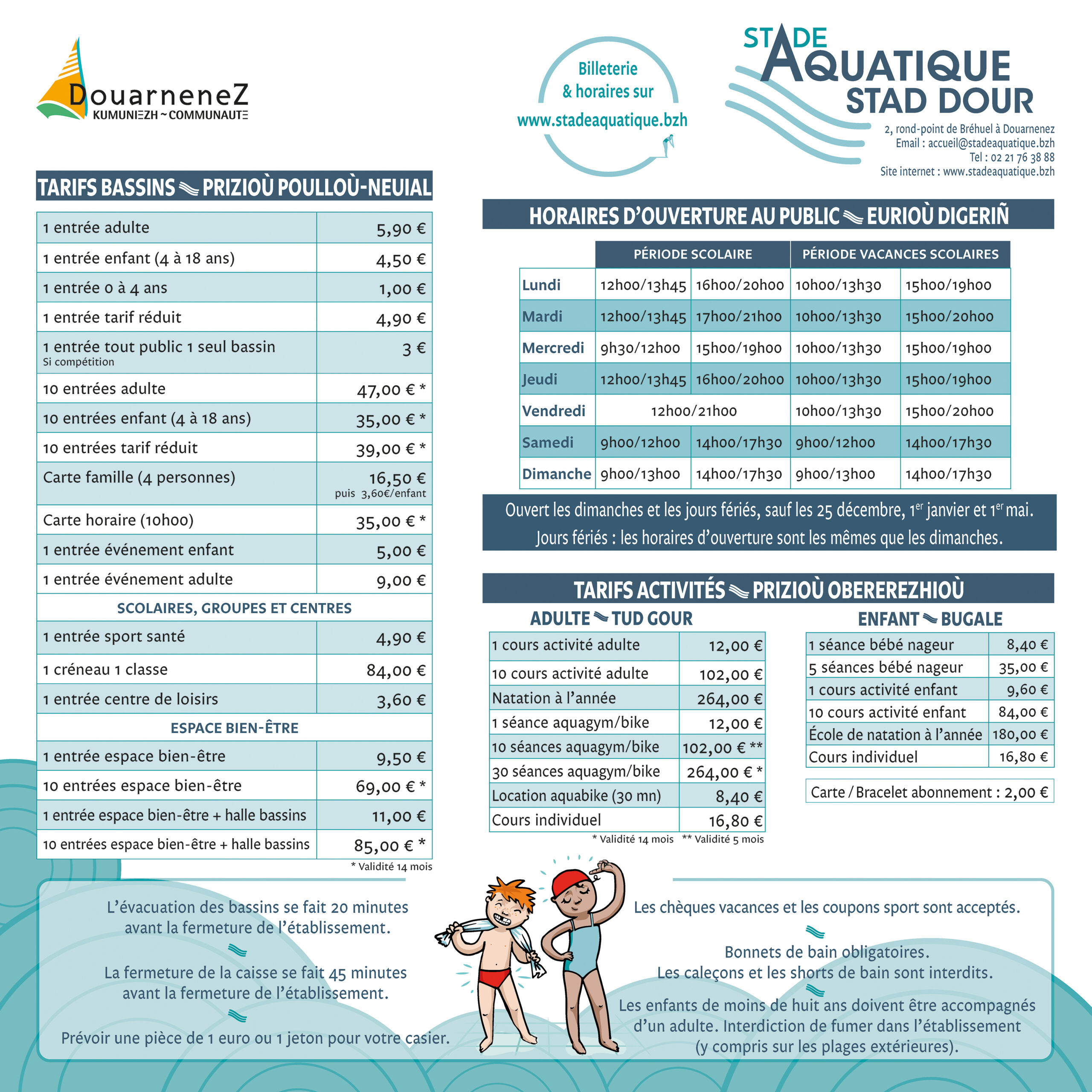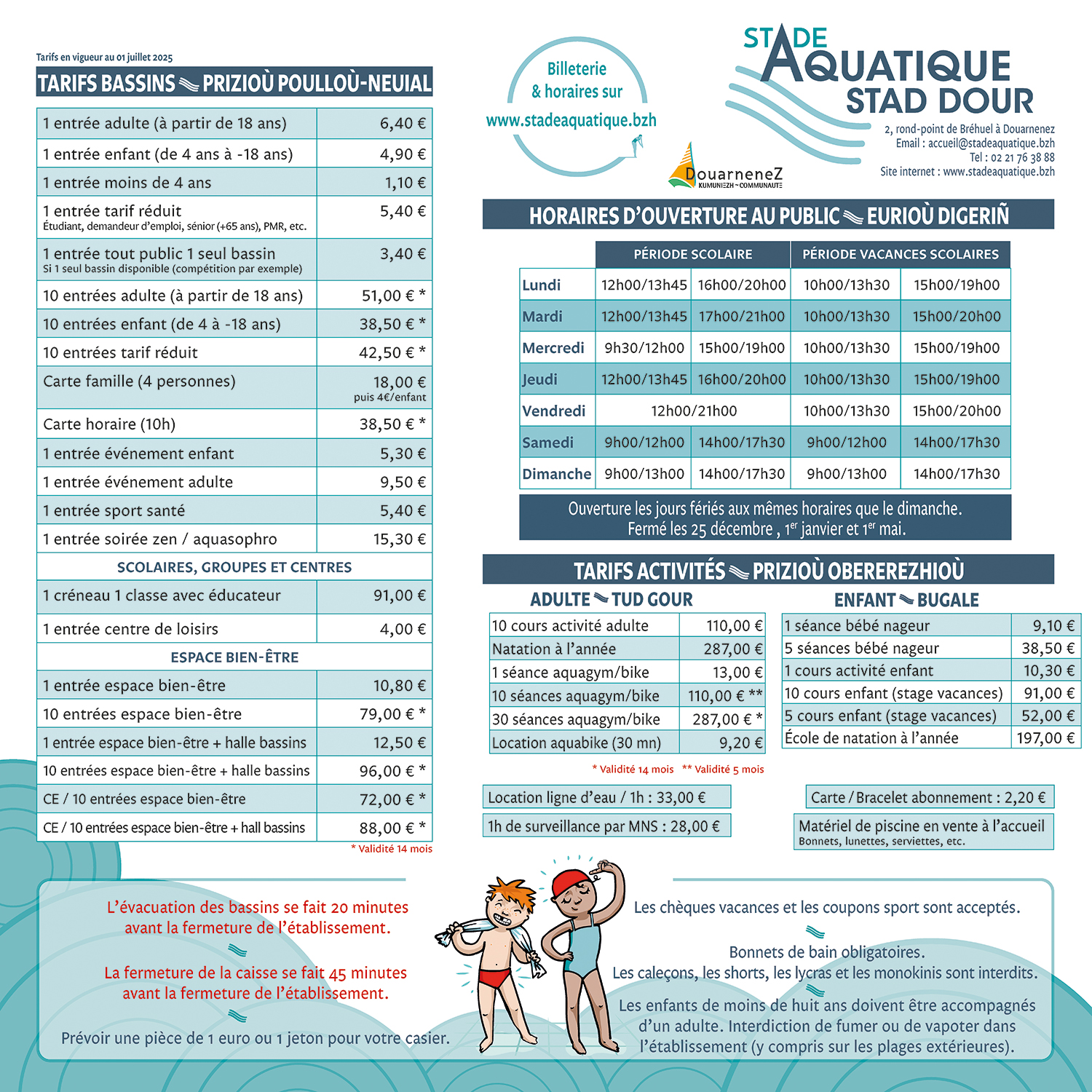 Fermeture : le Stade aquatique sera fermé au public à partir de 16h les 24 et 31 décembre 2025 (fermeture des bassins à 15h40). Il sera fermé au public le 25 décembre 2025 et le 01 janvier 2026.