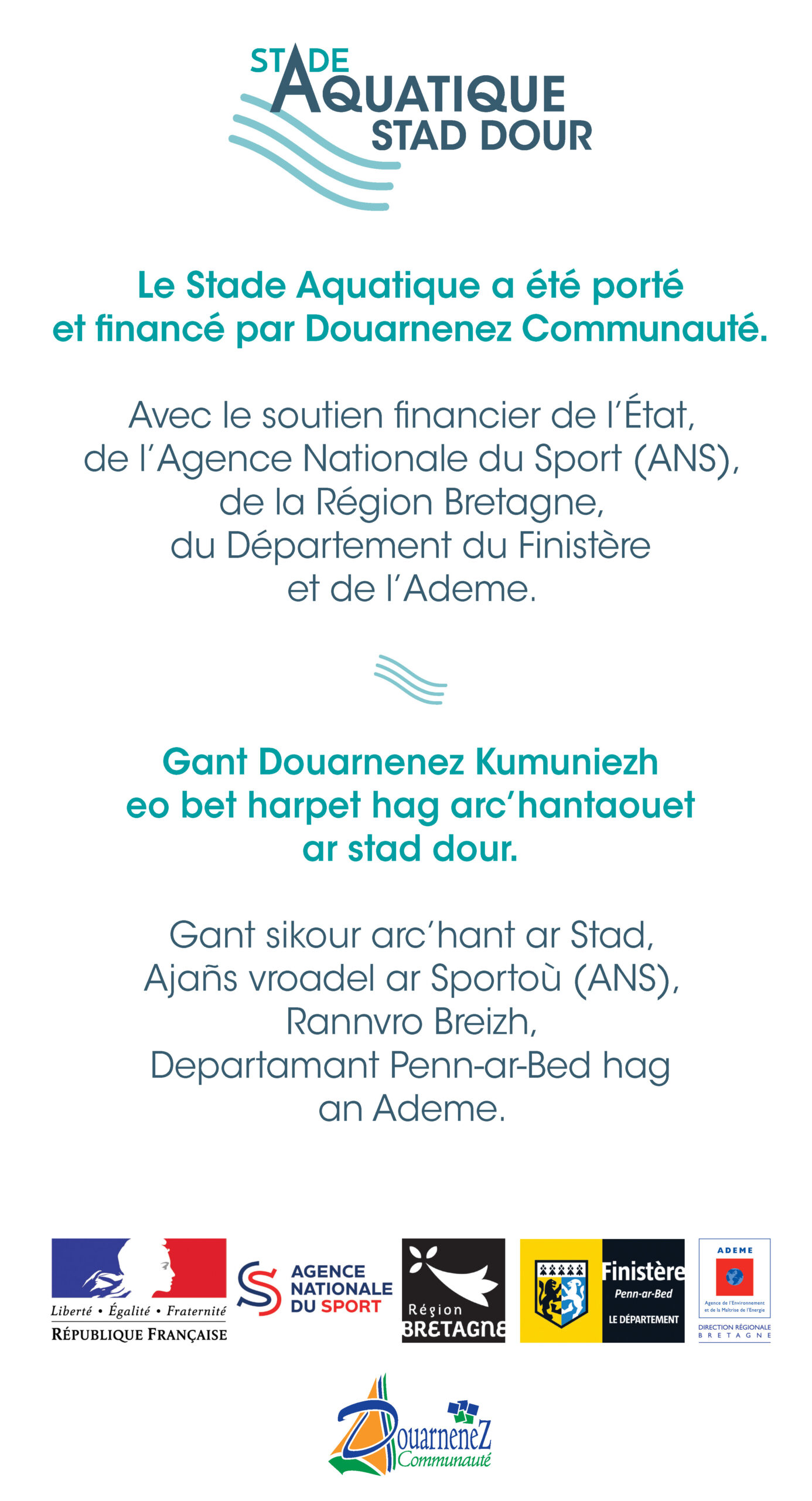 Le Stade aquatique a été financé par Douarnenez Communauté, l’Etat, l’Agence Nationale des Sports, la Région Bretagne, le Département du Finistère et l’ADEME.