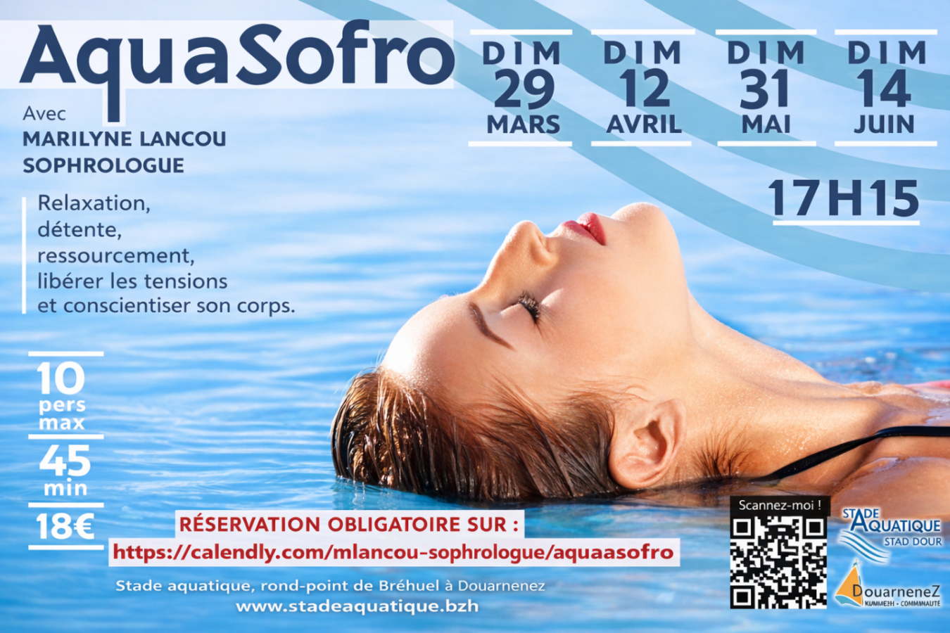 Sobriété énergétique : les actions mises en place au Stade aquatique26 octobre 2022Des ombrières photovoltaïques pour un Stade aquatique durable à Douarnenez Communauté16 décembre 2025 6 octobre 2025 Categories Actualités Evenements Tags Réservation et paiement en ligne sur : https://calendly.com/mlancou-sophrologue/aguasofro Partager Vous aimerez aussi...16 décembre 2025Des ombrières photovoltaïques pour un Stade aquatique durable à Douarnenez CommunautéEn lire plus26 octobre 2022Sobriété énergétique : les actions mises en place au Stade aquatiqueEn lire plus