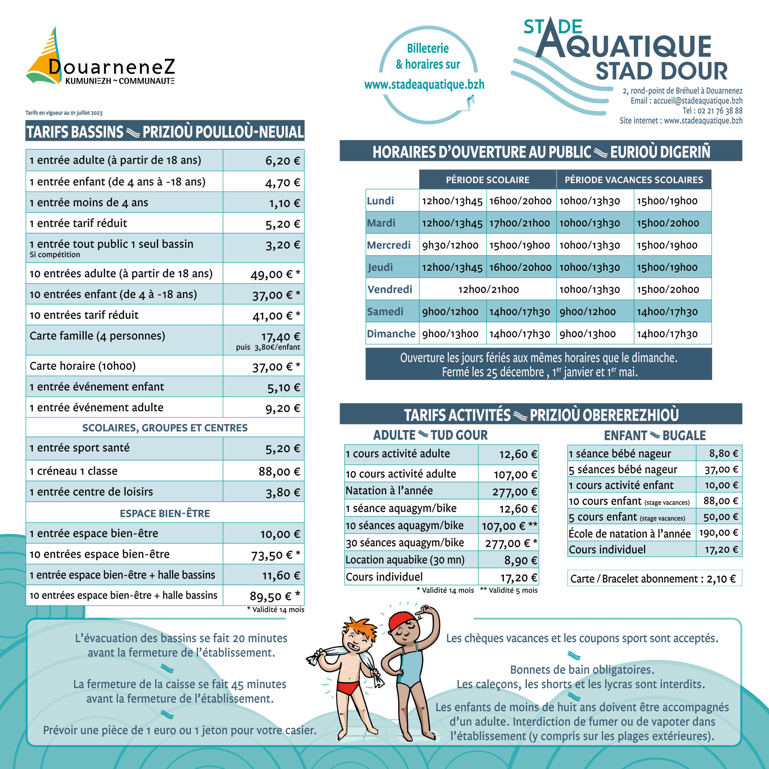 Retrouvez les tarifs et les horaires du Stade aquatique ci-après (nb : les horaires d’ouverture pendant les jours fériés sont les mêmes que les dimanches) :